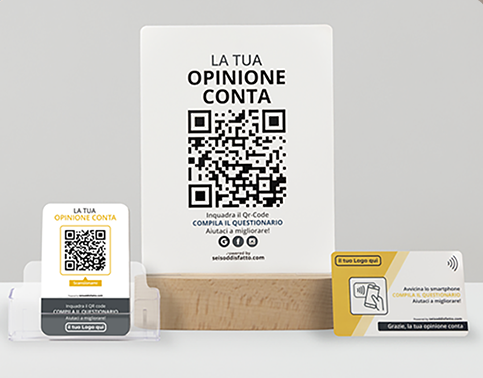 • Kit Migliora con QR Code: nel momento in cui un cliente lascia un feedback positivo tramite il questionario sul Totem, gli viene fornito un QR code dedicato per lasciare direttamente una recensione online, semplificando e incentivando il processo.